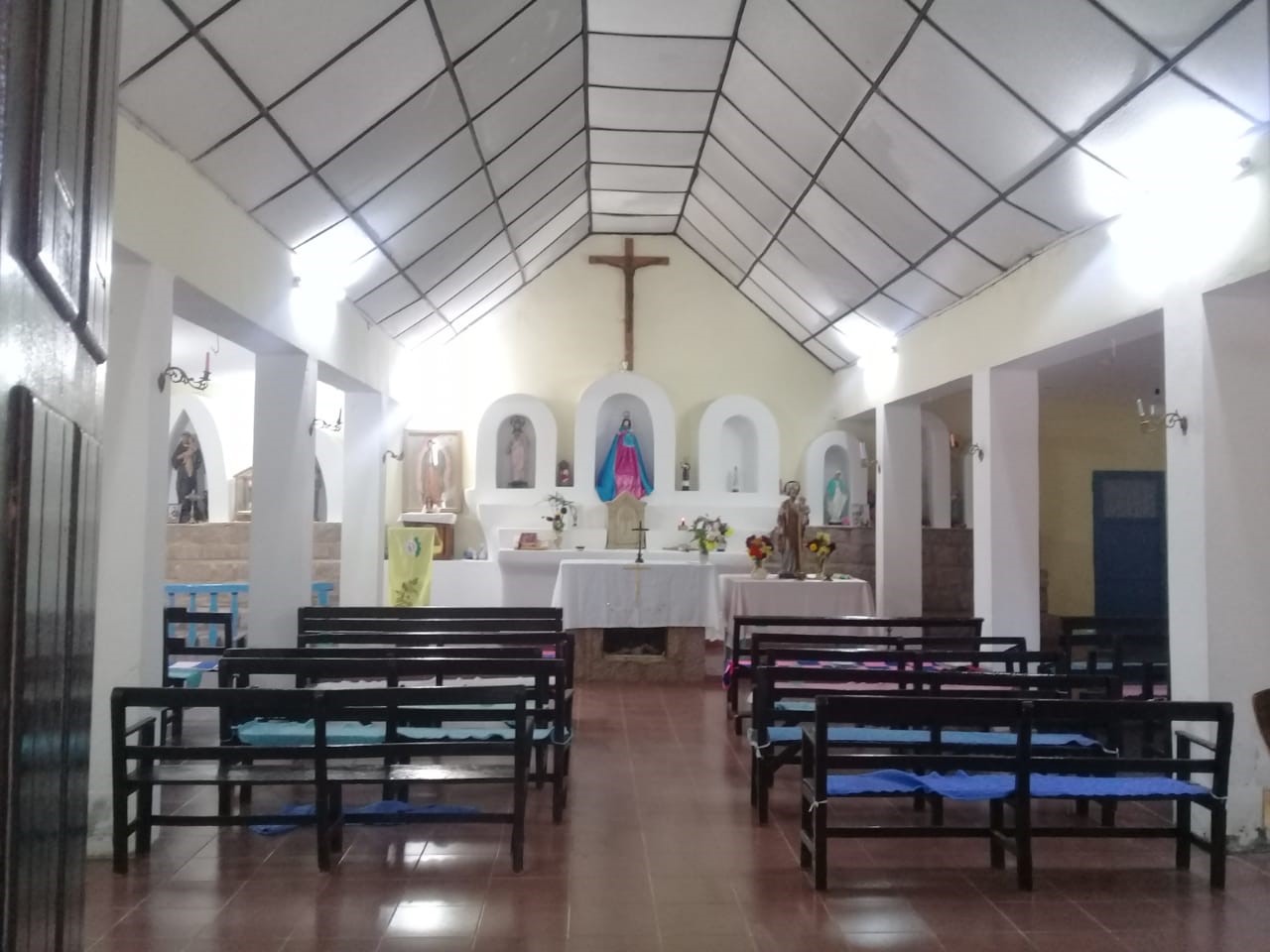 La madera de árbol fue tallada para darle diferentes formas. Construyeron un altar mayor con sus tres tronos para los santos patronos: Virgen del Rosario, San José y sagrado Corazón de Jesús.